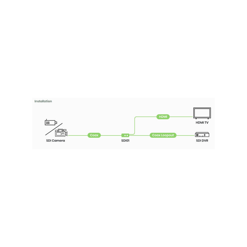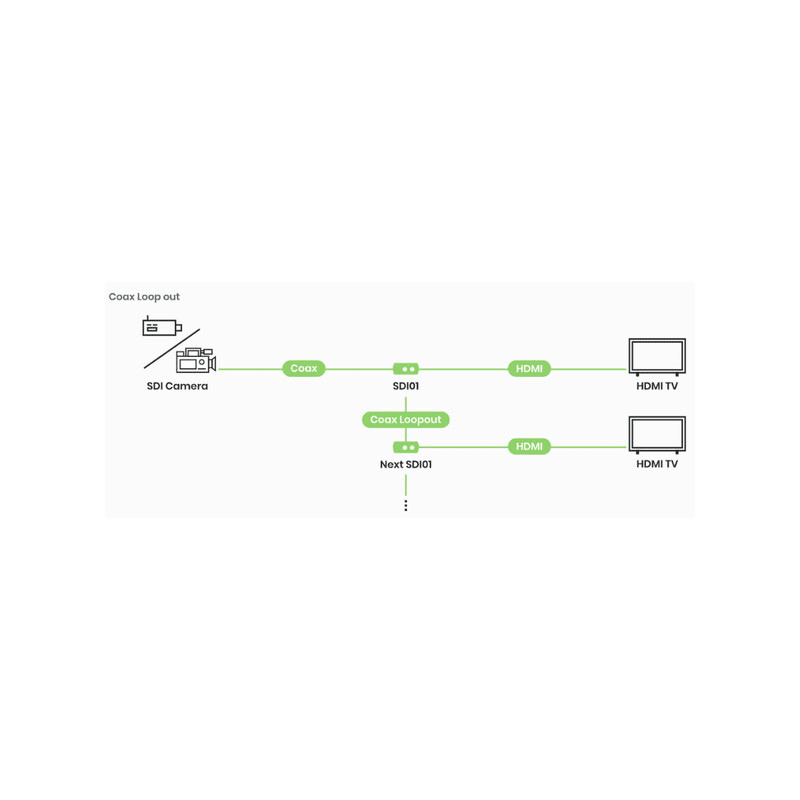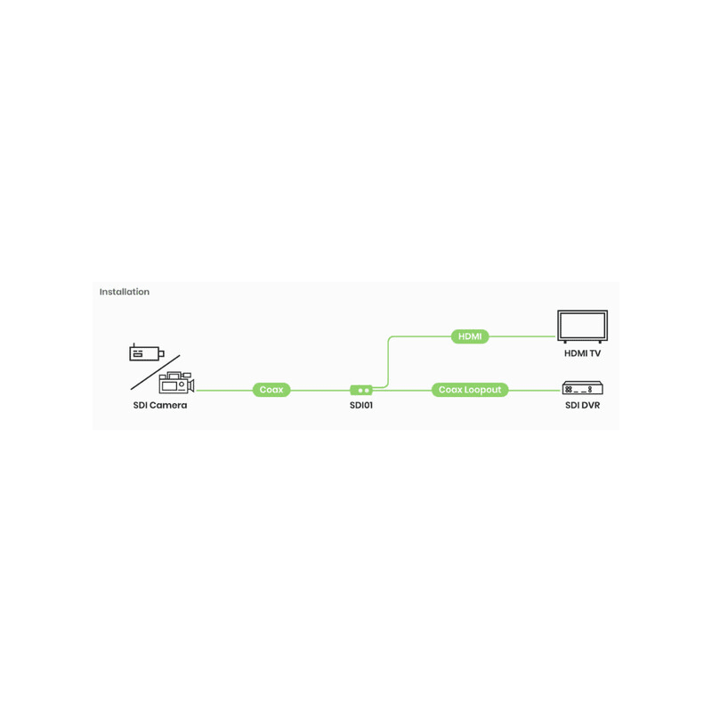 HD-SDI / HDMI -muunnin, sisältää SDI Loop-Out -lähdön SDI01 on SDI-HDMI -muunnin, jonka avulla pystyt liittämään ammattimaisen SDI-videolaitteen mihin tahansa HDMI-näyttöön.