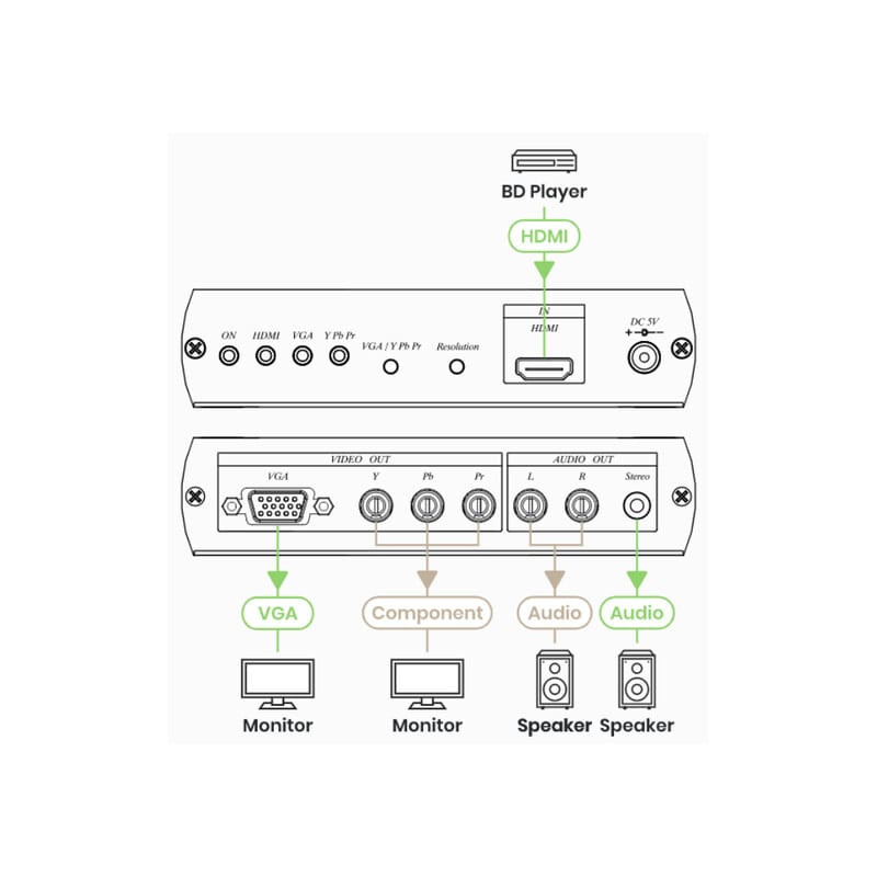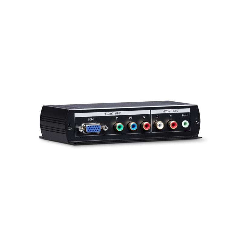 Voit siis näyttää HDMI-lähteen kuvan komponenttivideo- tai VGA-liitännällä varustetussa näytössä, projektorissa tai televisiossa, joissa HDMI-liitäntämahdollisuutta ei ole. VGA-liitintä käytettäessä voit viedä äänet joko näytölle tai erilliselle vahvistimelle joko RCA- tai 3,5mm jakkiliittimen kautta.