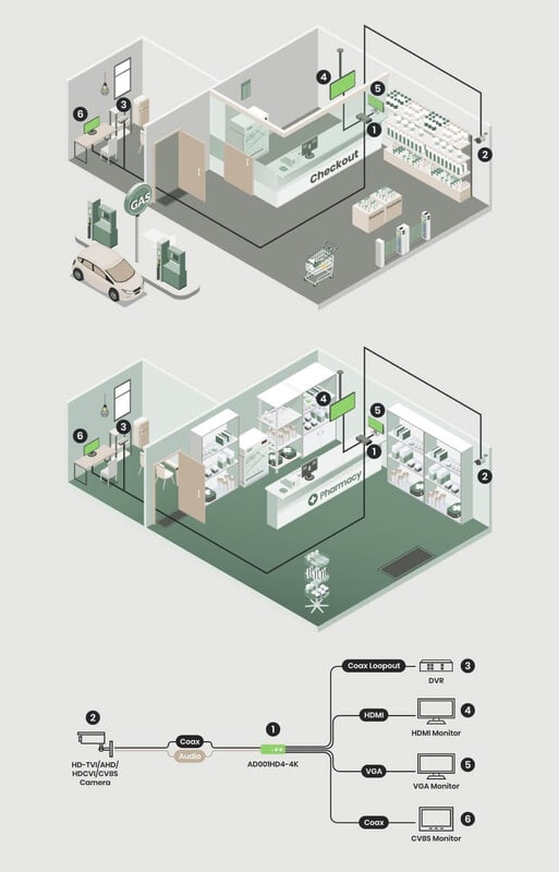 AD001HD4 on näppärä ratkaisu kauppoihin, kahviloihin ja parkkihalleihin, kun olemassa olevaan valvontakamerajärjestelmään halutaan lisätä uusia näyttöjä.