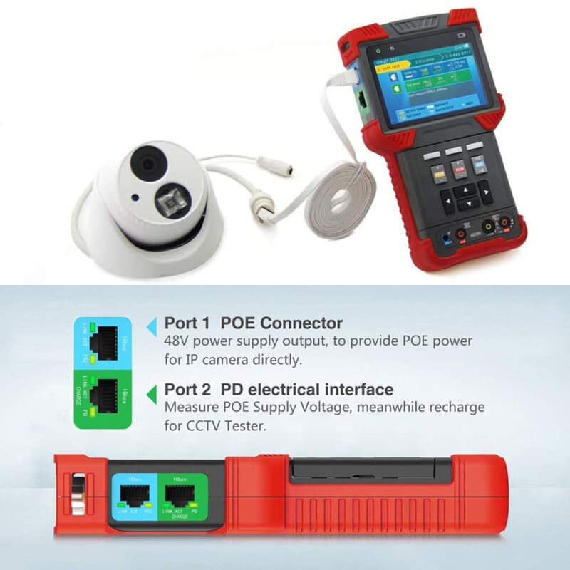 - PoE PD&PSE: PoE PSE-liitäntä, tehonsyöttö IP-kameralle PoE PD-liitäntä (Power Delivery) PoE-jännitteen mittaamiseen ja testerin lataamiseen