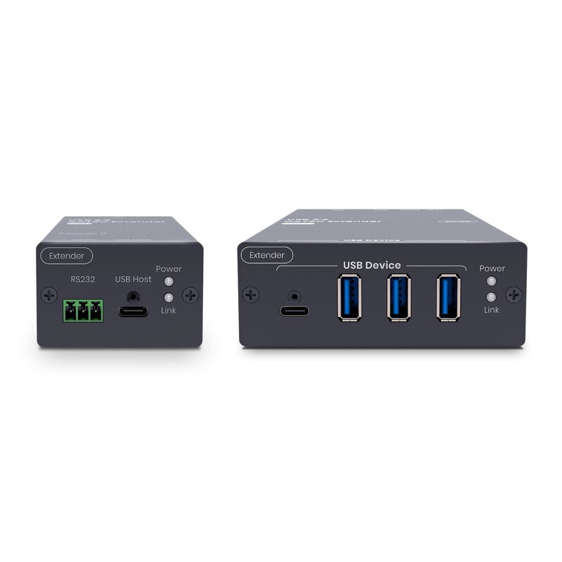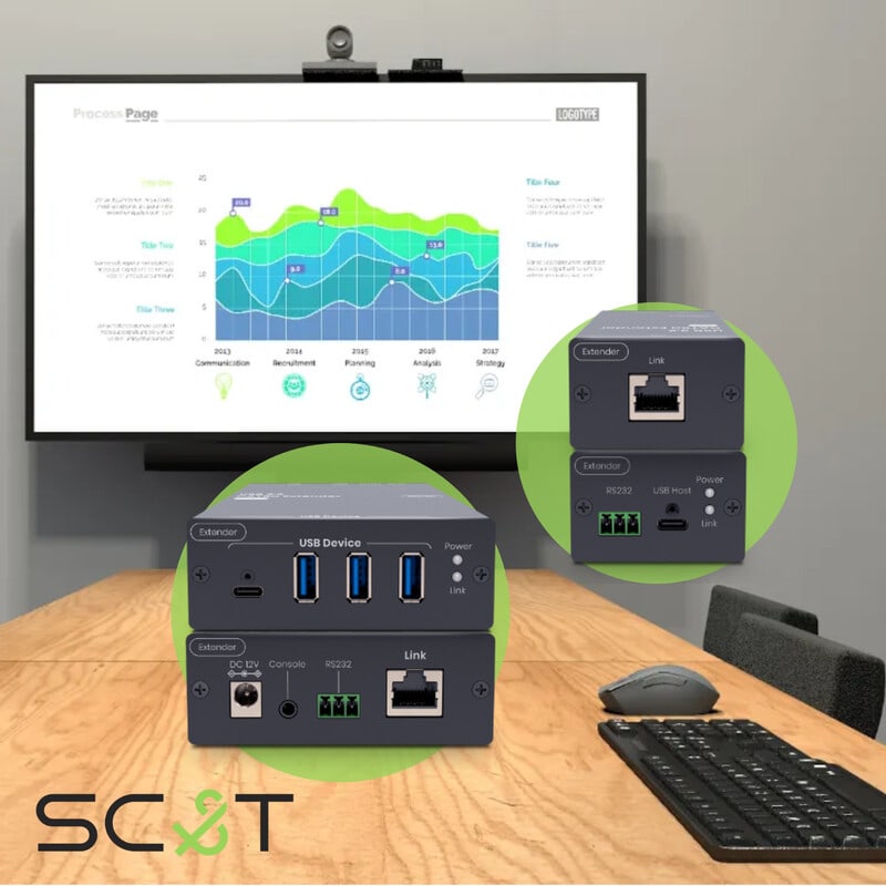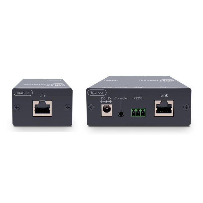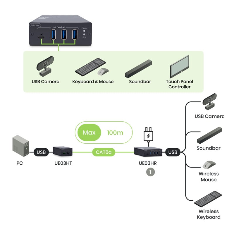 UE03H laajenninparin TX kytketään USB-C kaapelilla tietokoneeseen ja RX laitteeseen voidaan kytkeä 1x USB-C ja 3x USB-A laitetta. Tämä mahdollistaa koko neuvotteluhuoneen laitteiden käyttöonoton. Voit hoitaa yhdellä laiteparilla esimerkiksi USB-kameran, hiiren ja näppäimistön, soundbarin ja kosketusnäytön asennuksen.