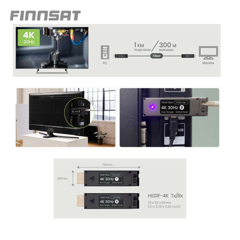 4K@30Hz HDMI-kuitulaajenninpari TX + RX, max. 1km yksimuotokuitu, 300mmonimuotokuitu HE01F-4K on HDMI-kuitulaajenninpari, jolla voit laajentaa HDMI-signaalin 4K 30Hz -resoluutiolla jopa kilometrin etäisyydelle yksimuotokuidulla ja 300m etäisyydelle monimuotokuidulla. Laitteessa on EDID/CEC/HDCP -tuki. Dongle-mallinen laitepari mahdollistaa helpon Plug and Play -asennuksen mihin tahansa AV-laitteeseen.