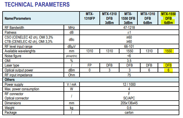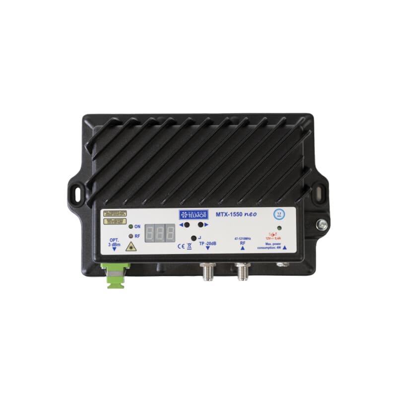 RF-signaali taajuusalueella 47-1218 MHz. RF-signaali säätyy automaattisesti AGC:n avulla, mutta myös manuaalinen säätö on mahdollinen. MTX1550NEO-6 lähettimellä voit lähettää signaalin jopa 20 kilometrin etäisyydelle tai jakaa sen optisella jaottimella useammalle vastaanottimelle. Vastaanottimeksi soveltuu esimerkiksi Telkom Telmorin MOB100, MOB923A, MOB729-1-C tai muu vastaava optinen vastaanotin.