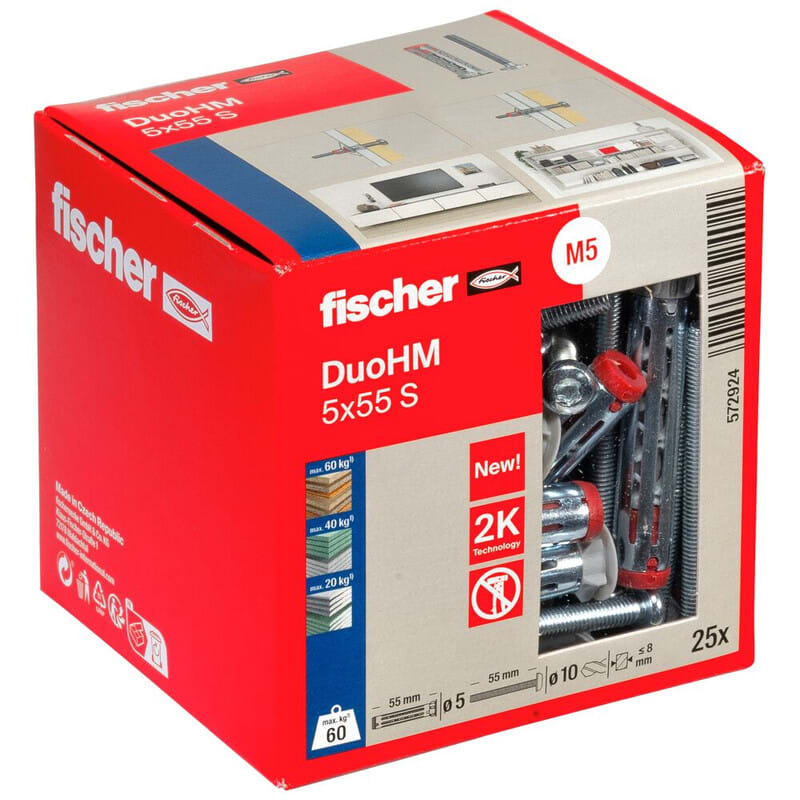 Fischer DuoHM kipsilevyankkuri 5x55 S TX25 25kpl Nailonista ja metallista valmistettu kipsilevyankkuri erityyppisille kipsi- ja kuitukipsilevyille. Ankkurissa on mukana metrinen ruuvi erilaisten esineiden kiinnitykseen. Erittäin helppo asentaa porattuun reikään, erillistä asennustyökalua et tarvita. Samaa ankkuria voidaan käyttää sekä yksi- että kaksikerroksisille kipsilevyille.