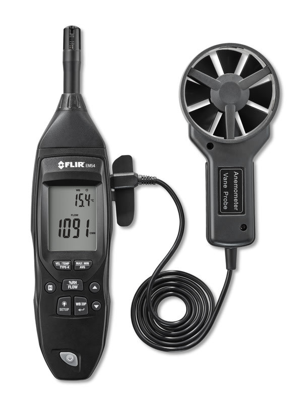 FLIR EM54 on LVIK-alan ammattilaisen tarkka ja luotettava ympäristömittari. Monipuolisella mittarilla mittaat ilman nopeuden, ilmavirran, ilman lämpötilan, suhteellisen kosteuden, kastepisteen, märkälämpötilan sekä lämpötilan K-tyypin lämpötila-anturilla.