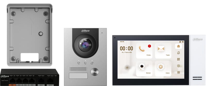 Dahua video-ovipuhelin, joka sisältää yhden video-ovitaulun ja yhden sisäyksikön.