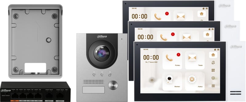 Dahua video-ovipuhelin, joka sisältää kaksi video-ovitaulua ja yhden sisäyksikön.