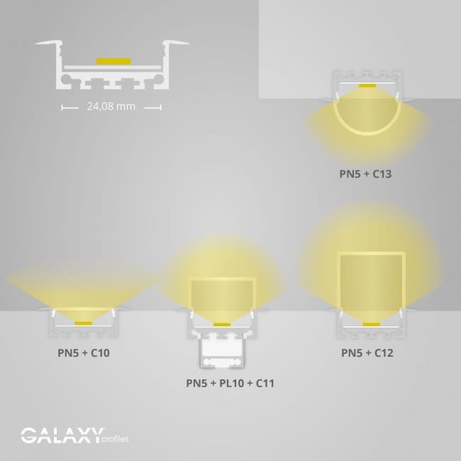 PN5 LED uppoas. profiili, alumiini eloksoitu, 200cm Galaxy®-profiles profiilivalikoima on tarkoitettu LED-nauhoille, joissa on kiinnitysteippi valmiina. Tyylikkäät profiilit toimivat hyvänä lämmönjohtimena LED-nauhalle ja edesauttavat nauhan pitkää ikää. Mallisto kattaa laajan valikoiman erilaisia profiileja pinta- ja uppoasennukseen sekä kaikki tarvittavat lisätarvikkeet. Värivaihtoehdot ovat eloksoitu, valkoinen tai musta. Suojakansi parantaa valaistusominaisuuksia ja toimii samalla mekaanisena suojana avoimille LED-nauhoille. Profiilit soveltuvat sisä- ja ulkokäyttöön. Mallistosta löytyy myös LED-nauhojen jäähdytysprofiilit.