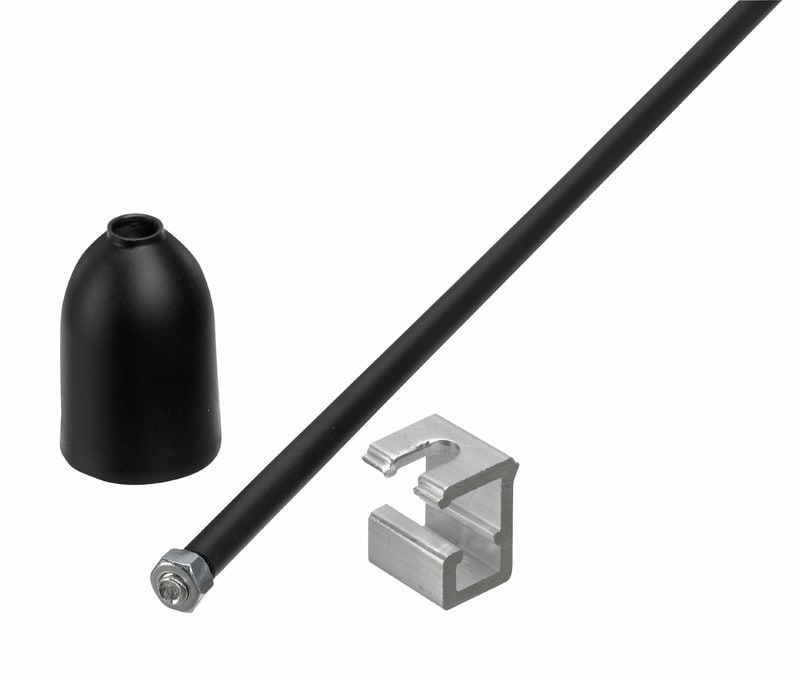 LisätietojaM6-kierteellä varustettu kierretanko 1000mm, kierretangonsuojausukka, kattokiinnike ja -kuppi musta GLOBAL Trac kosketinkiskoasennuksiin Lisätietoja