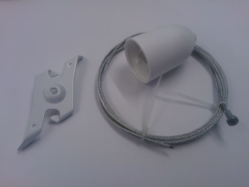 Sisältää seuraavat komponentit: kattokiinnike, suojakupu, 1.5m vaijeri, säätönippa ja kiskokiinnike