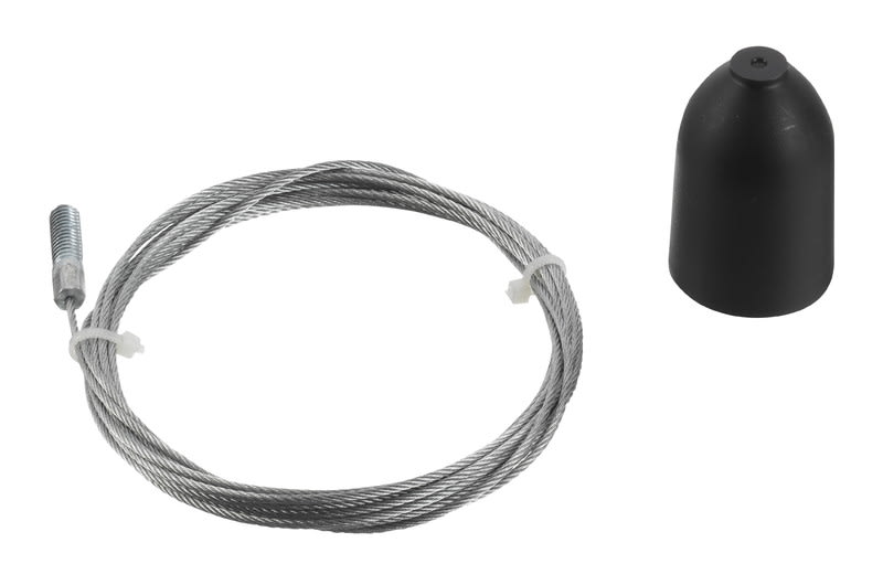 3m säädettävä ripustusvaijeripakkaus GLOBAL Trac kosketinkiskoille. Fmax. 150N. Sisältää seuraavat komponentit: kattokiinnike, säädettävä vaijerilukko, suojakupu ja 3m vaijeri jonka päässä M6 kierreruuvi.