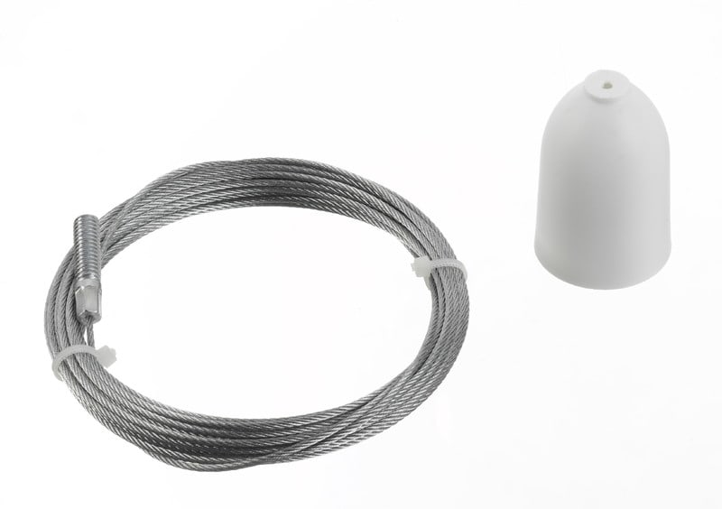 3m säädettävä ripustusvaijeripakkaus GLOBAL Trac kosketinkiskoille. Fmax. 150N. Sisältää seuraavat komponentit: kattokiinnike, säädettävä vaijerilukko, suojakupu ja 3m vaijeri jonka päässä M6 kierreruuvi.