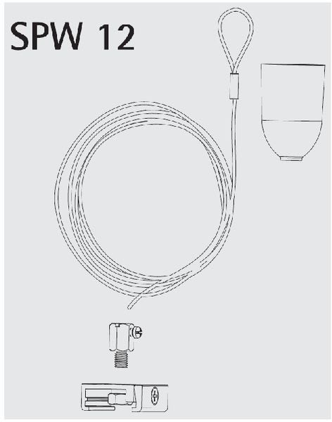 Sisältää seuraavat komponentit: kattokiinnike, suojakupu, 3m vaijeri silmukalla, korkeudensäätönippa SPW66, M6 mutteri ja kiskokiinnike SKB12