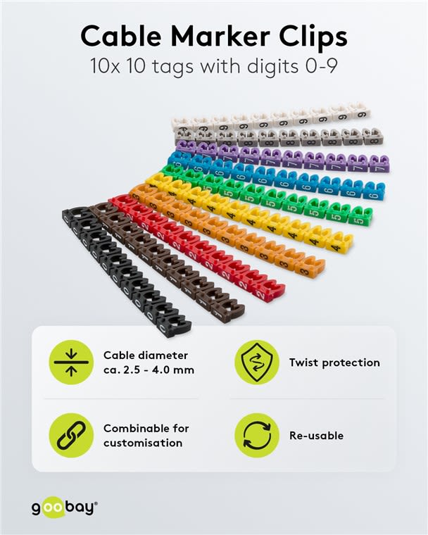 Goobay PVC-kaapelirenkaat ovat erinomainen ratkaisu kaapelointien merkintään teollisuudessa, rakentamisessa ja sähköasennuksissa. Merkintäklipsit vähentävät asennusvirheitä ja parantavat turvallisuutta huolto-, asennus- ja korjaustöissä. Ne auttavat ehkäisemään kaapeleiden sekaantumista ja pienentävät onnettomuusriskiä.