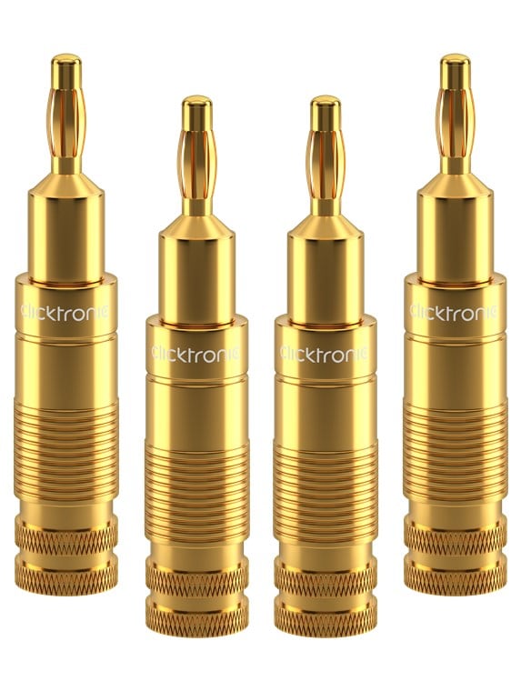 Premium-sovitin. Banaani Plug. 6,0 mm² Neljän liittimen sarja kaiutinkaapeleiden kokoamiseen ilman työkaluja, kaapeleille aina 6,0 mm² poikkipintaan asti. 4 mm banaaniliittimet soveltuvat erinomaisesti kaikkiin kaiutinkaapelikytkentöihin. Kompakti lamelliliitin mahdollistaa helpon liitännän laitteisiin, kuten kaiuttimiin ja vahvistimiin. Kolminkertainen ruuvikiristys takaa varman pidon ja nopean asennuksen. 24 karaatin kultapinnoitetut, ruostumattomasta teräksestä valmistetut banaaniliittimet tarjoavat minimaalisen siirtovastuksen ja kristallinkirkkaan äänenlaadun. Clicktronic‑ääniliitin, jossa on kätevä kiristysruuvi, tekee käsittelystä vaivatonta.