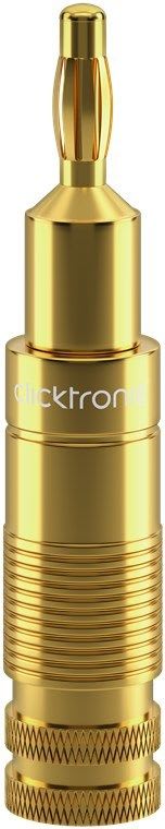 Premium-sovitin. Banaani Plug. 6,0 mm² 4 liittimen sarja kaiutinkaapeleiden kokoamiseen, joiden poikkileikkaus on enintään 6,0 mm² (ilman työkaluja) 4 mm:n banaaniliitin sopii täydellisesti kaikkiin kaiutinkaapeliliitäntöihin. Kompakti lamellipistoke tukee laitteiden, kuten kaiuttimien, ampnostimet tai kaiuttimet. 3-kertainen ruuviliitos varmistaa turvallisen pidon ja nopean liitoksen. 24 karaatin kullattu ruostumattomasta teräksestä valmistettu banaanipistokesovitin minimoi lähetysvastuksen ja kristallinkirkkaan äänen Clicktronic-äänipistoke kiristysruuvilla helpottaa käsittelyä