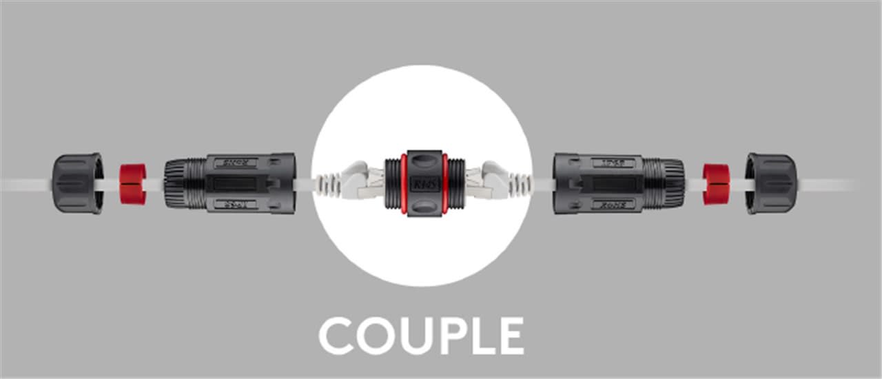 IP68‑luokiteltu, täysin pöly‑ ja vesitiivis RJ45‑ulkokäyttöön tarkoitettu jatkoliitin. Soveltuu CAT6‑kaapeleiden jatkamiseen vaativissa olosuhteissa (ulkona, teollisuudessa). Erittäin kapea rakenne ja vesitiivis kaapeliläpivienti.