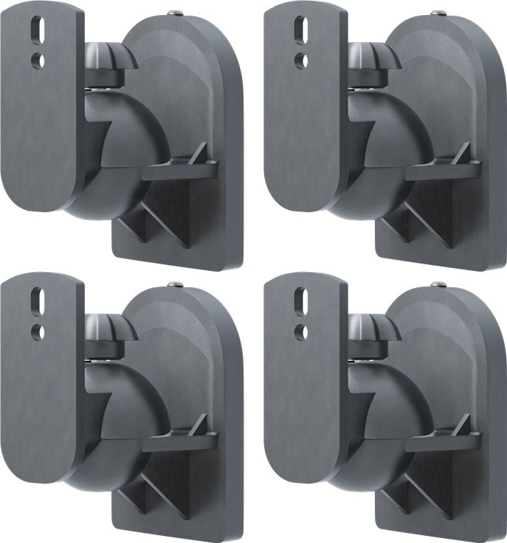 Goobay Universal Speaker Wall Mount, 4 kpl, musta. Sopii useimmille kaiuttimille, säädettävä kallistus ja kääntö. Kaiuttimen etäisyys seinästä 6,4 cm.
