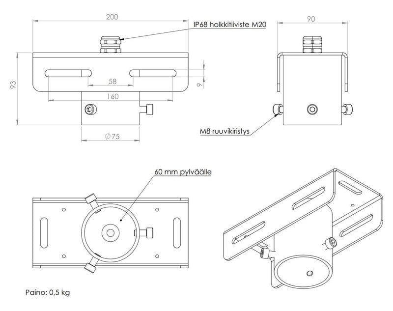 LMP3021-valonheittimen pylväskiinnike soveltuu 60 mm:n pylväisiin. Suurin kiinnitettävä massa on 2 × 7 kg.