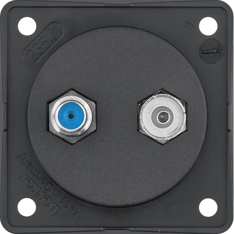 Antenniliityntärasia radio/SAT musta matta Antenniliityntärasia radio/SAT, soveltuu käytettäväksi saranakannettomien peitelevyjen kanssa. Varustettu IEC- ja F-pistokkeella, liitäntä F-järjestelmään takana.