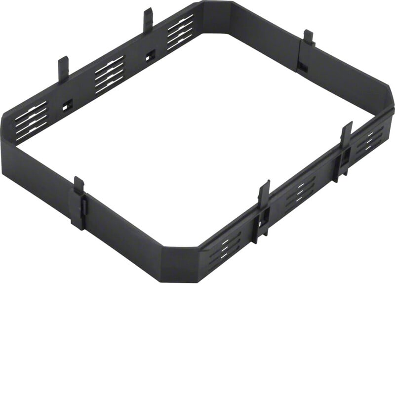 Kehys PA jolla voidaan korottaa lattaiarasian VE09 kojerasia tilaa 30mm.Snap on kiinnitys. Kiinnitysrasterin jatkokehys kojerasiakiinnitysrasterin jatkamiseksi 30 mm PA lattiarasiakansille VE09 Kiinnitysrasterin jatkokehys kojerasian kiinnittämiseksi normaalia syvemmälle lattiarasiakannen alla. Portaittainen säätömahdollisuus, maksimisäätövaran kasvatus 30 mm per jatkokehys. Materiaali: Polyamidi (PA) Halogeeniton: kyllä Väri: musta