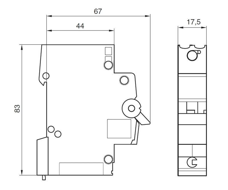 Johdonsuojakatkaisija 1-napainen. ruuviliittimillä. katkaisukyky 6kA.C-käyrä. nimellisvirta 16A. koko 1 moduuli Johdonsuojakatkaisija 1-napainen 6kA C-käyrä 16A, koko 1 moduulia. Johdonsuoja DIN EN 69898-1 (VDE 0641 osa 11) : 2003-12, EN 60898-1, A1: 2003 mukaan. Kosketussuojaus IP2x DIN VDE 0106 osa 100 mukaan. Johdonsuojakatkaisija on varustettu viivetoimisella termisellä laukaisimella ylikuormitussuojaukseen ja sähkömagneettisella laukaisimella oikosulkusuojaukseen. Voidaan varustaa jälkiasennettavilla lisämoduuleilla. Laite on varustettu merkintäikkunalla ja se on vaihdettavissa virtakiskoasennuksesta vapauttamalla DIN-kiskokiinnike ääriasentoon.