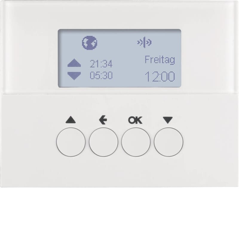 Kellokytkin RF 1-kanavainen astro-toiminnolla verho-ohjauksiin kiiltävä puhtaanvalkoinen. verho-ohjausrunko 85221100yksittäiskäyttöön tai tehonsyöttörunko 85020100 langattomaan käyttöön tilattava erikseen. peitelevyille K.1 Verhokellokytkinkeskiö LCD-näytöllä moottoriverhojen paikalliseen ja etäohjaukseen langattoman toiminnon avulla. Käyttö yhteensopivan verho-ohjauskojerungon tai teholähderungon kanssa. Yhteensopiva painikeopetettuna muiden quicklink-tuotteiden kanssa radiolinkillä maksimissaan 20 laitteen asennuksiiin. Voidaan liittää osaksi kaapeloitua KNX-asennusta mediakytkimen TR131A kautta.