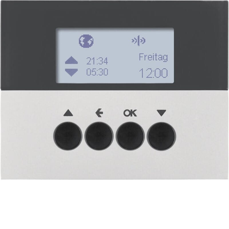 Kellokytkin RF 1-kanavainen astro-toiminnolla verho-ohjauksiin matta anodisoitu alumiini maalattu. verho-ohjausrunko 85221100yksittäiskäyttöön tai tehonsyöttörunko 85020100 langattomaan käyttöön tilattava erikseen. peitelevyille K.5 Verhokellokytkinkeskiö LCD-näytöllä moottoriverhojen paikalliseen ja etäohjaukseen langattoman toiminnon avulla. Käyttö yhteensopivan verho-ohjauskojerungon tai teholähderungon kanssa. Yhteensopiva painikeopetettuna muiden quicklink-tuotteiden kanssa radiolinkillä maksimissaan 20 laitteen asennuksiiin. Voidaan liittää osaksi kaapeloitua KNX-asennusta mediakytkimen TR131A kautta.