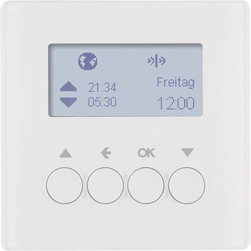 Kellokytkin RF 1-kanavainen astro-toiminnolla verho-ohjauksiin samettinen puhtaanvalkoinen, verho-ohjausrunko 85221100yksittäiskäyttöön tai tehonsyöttörunko 85020100 langattomaan käyttöön tilattava erikseen, peitelevyille S.1/B.3/B.7 55x55-keskiöBerker. Verhokellokytkinkeskiö LCD-näytöllä moottoriverhojen paikalliseen ja etäohjaukseen langattoman toiminnon avulla. Käyttö yhteensopivan verho-ohjauskojerungon tai teholähderungon kanssa. Yhteensopiva painikeopetettuna muiden quicklink-tuotteiden kanssa radiolinkillä maksimissaan 20 laitteen asennuksiiin. Voidaan liittää osaksi kaapeloitua KNX-asennusta mediakytkimen TR131A kautta.