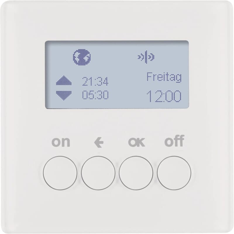Kellokytkin RF 1-kanavainen astro-toiminnolla samettinen puhtaanvalkoinen, relerunko 85121200 yksittäiskäyttöön taitehonsyöttörunko 85020100 langattomaan käyttöön tilattava erikseen, soveltuvat peitelevyt S.1/B.3/B.7 55x55 -keskiöaukolla,Berker.NET Radiokellokytkin quicklink digitaalisella näyttö