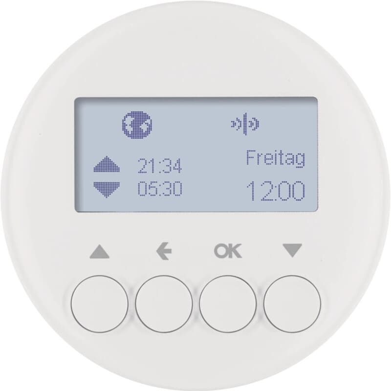 Kellokytkin RF 1-kanavainen astro-toiminnolla verho-ohjauksiin puhtaanvalkoinen, verho-ohjausrunko 85221100 yksittäiskäyttöön taitehonsyöttörunko 85020100 langattomaan käyttöön tilattava erikseen, soveltuvat peitelevyt R.1/R.3, Berker.NET Verhokellokytkinkeskiö LCD-näytöllä moottoriverhojen paikalliseen ja etäohjaukseen langattoman toiminnon avulla. Käyttö yhteensopivan verho-ohjauskojerungon tai teholähderungon kanssa. Yhteensopiva painikeopetettuna muiden quicklink-tuotteiden kanssa radiolinkillä maksimissaan 20 laitteen asennuksiiin. Voidaan liittää osaksi kaapeloitua KNX-asennusta mediakytkimen TR131A kautta.