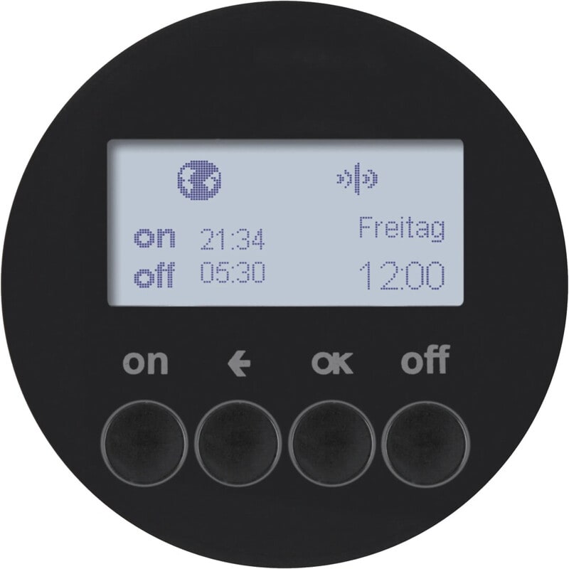 Kellokytkin RF 1-kanavainen astro-toiminnolla musta, relerunko 85121200 yksittäiskäyttöön tai tehonsyöttörunko 85020100langattomaan käyttöön tilattava erikseen, soveltuvat peitelevyt R.1/R.3, Berker.NET Radiokellokytkin quicklink digitaalisella näyttö