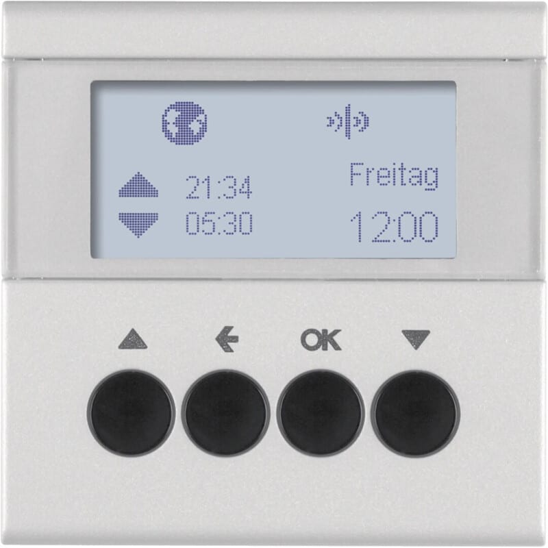 Kellokytkin RF 1-kanavainen astro-toiminnolla verho-ohjauksiin matta alumiini, verho-ohjausrunko 85221100 yksittäiskäyttöön taitehonsyöttörunko 85020100 langattomaan käyttöön tilattava erikseen, peitelevyille S.1/B.3/B.7 55x55-keskiö Berker.NET Verhokellokytkinkeskiö LCD-näytöllä moottoriverhojen paikalliseen ja etäohjaukseen langattoman toiminnon avulla. Käyttö yhteensopivan verho-ohjauskojerungon tai teholähderungon kanssa. Yhteensopiva painikeopetettuna muiden quicklink-tuotteiden kanssa radiolinkillä maksimissaan 20 laitteen asennuksiiin. Voidaan liittää osaksi kaapeloitua KNX-asennusta mediakytkimen TR131A kautta.