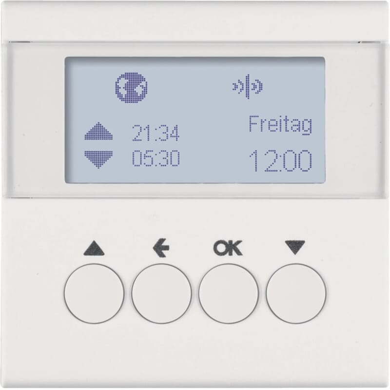Kellokytkin RF 1-kanavainen astro-toiminnolla verho-ohjauksiin matta puhtaanvalkoinen, verho-ohjausrunko 85221100 yksittäiskäyttööntai tehonsyöttörunko 85020100 langattomaan käyttöön tilattava erikseen, peitelevyille S.1/B.3/B.7 55x55-keskiö Berker.NET Verhokellokytkinkeskiö LCD-näytöllä moottoriverhojen paikalliseen ja etäohjaukseen langattoman toiminnon avulla. Käyttö yhteensopivan verho-ohjauskojerungon tai teholähderungon kanssa. Yhteensopiva painikeopetettuna muiden quicklink-tuotteiden kanssa radiolinkillä maksimissaan 20 laitteen asennuksiiin. Voidaan liittää osaksi kaapeloitua KNX-asennusta mediakytkimen TR131A kautta.