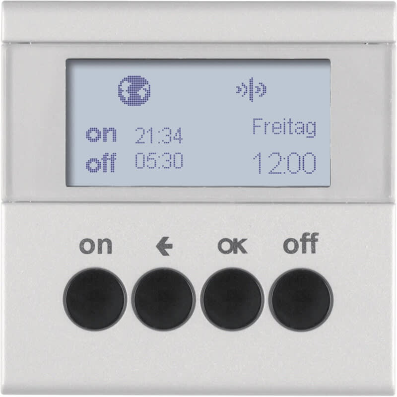 Kellokytkin RF 1-kanavainen astro-toiminnolla matta alumiini, relerunko 85121200 yksittäiskäyttöön tai tehonsyöttörunko 85020100langattomaan käyttöön tilattava erikseen, soveltuvat peitelevyt S.1/B.3/B.7 55x55 -keskiöaukolla, Berker.NET Radiokellokytkin quicklink digitaalisella näyttö