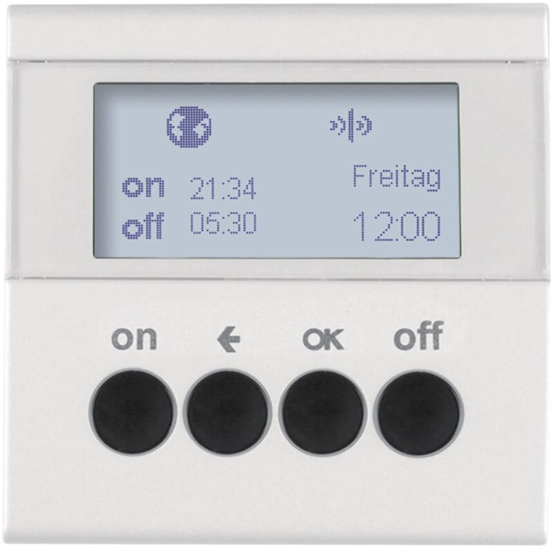 Kellokytkin RF 1-kanavainen astro-toiminnolla matta puhtaanvalkoinen, relerunko 85121200 yksittäiskäyttöön tai tehonsyöttörunko85020100 langattomaan käyttöön tilattava erikseen, soveltuvat peitelevyt S.1/B.3/B.7 55x55 -keskiöaukolla, Berker.NET Radiokellokytkin quicklink digitaalisella näyttö