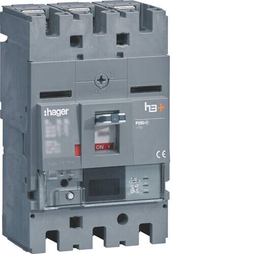 Kompaktikatkaisija standardin DIN EN 60947-2 mukaan suojaa sähköasennusta ja verkkoa ylikuormitukselta ja oikosuluilta. Elektronisen suojareleen laukaisukäyrä voidaan asettaa integroidulla OLED-näytöllä, yhdistettävällä ovinäytöllä tai katkaisijaan adapterikaapelilla liitettävän tietokoneen Hager Power Setup -sovelluksella. Ylikuormitusvirran (Ir), lyhytaikaisen viivästetyn oikosulkusuojan (Isd) ja hetkellisen oikosulkusuojauksen (Ii) raja-arvot voidaan asettaa erikseen, samoin kuin aikaviive tr ylikuormitustapauksissa ja aikaviive tsd lyhytaikaista viivästettyä oikosulkulaukaisua varten. Lisäksi laukaisukäyrää voidaan säätää kääntäen verrannollisesti oikosulkuvirtojen Ii ja Isd sekä lyhytaikaisen viiveen ja välittömän laukaisuajan välillä olevan aktivoitavan I²t-toiminnon avulla. Valmis-LED palaa vihreänä, kun katkaisija on käyttövalmis, ja vilkkuu oranssina, kun katkaisijassa havaitaan sisäinen vika. Ylivirran merkkivalo alkaa vilkkua punaisena, kun I = 105 % Ir ja pysyy punaisena, kun I > 112 % Ir. Laitteen vipu voidaan lukita ON- ja OFF-asentoihin vipuun integroidun toiminnallisuuden ja normaalin riippulukon avulla, ilman muita lisätarvikkeita. Katkaisumekanismia voidaan testata ja pääkoskettimet avata vapautuspainikkeella. Saranoitu kansi, jossa on kiinteä pikalukitusruuvi, mahdollistaa pääsyn asennustilaan erikseen tilattavien apukoskettimien ja laukaisimien asentamiseksi. Katkaisijan sisälle asennetut lisävarusteet voidaan havaita ja tunnistaa katseluikkunasta avaamatta saranoitua kantta. Vakiovarusteena on potentiaalivapaa hälytyskosketin poiskytkentää varten, kun on olemassa ylikuormituksen aiheuttama katkaisuvaara. Tämä on suljettu, kun I > 90 % Ir (oletusarvo muutettavissa). Tämä ilmaistaan ylimääräisellä LED-valolla. Se palaa oranssina, kun kosketin on kiinni. Asetettu laukaisukäyrä voidaan testata ja dokumentoida diagnostiikka- ja konfigurointityökalun käyttöliittymän kautta. Integroitu mittaustekniikka mittaa kaikki energiat luokan 1 tarkkuudella IEC 61557-12:n mukaan. Energian osittaislaskuri voidaan nollata. H3+ Energy -kompaktikatkaisijaa voidaan käyttää myös virrankulutusarvojen mittaukseen. Nämä mittaukset voivat perustua kiinteään tai liukuvaan aikaväliin, joka voidaan asettaa välillä 5 - 60 minuuttia 1 minuutin välein. Mittausikkuna voidaan synkronoida tiedonsiirtojärjestelmästä COM-moduulin kautta lähetettävän signaalin kanssa. Näiden kulutusarvojen avulla voidaan luoda trendejä ja ennusteita näiden tietojen perusteella. Ne tarjoavat perustiedot kuormitusprofiilin kehittymisestä. Lisäksi h3+ Energy -kompaktikatkaisijat mittaavat virran ja jännitteen harmonisen kokonaissärön (THD).