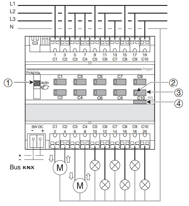HAGER - Lähtöyksikkö KNX tebis - TYA610C 10x16A RLV DIN