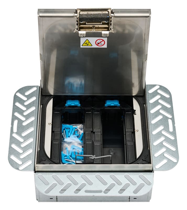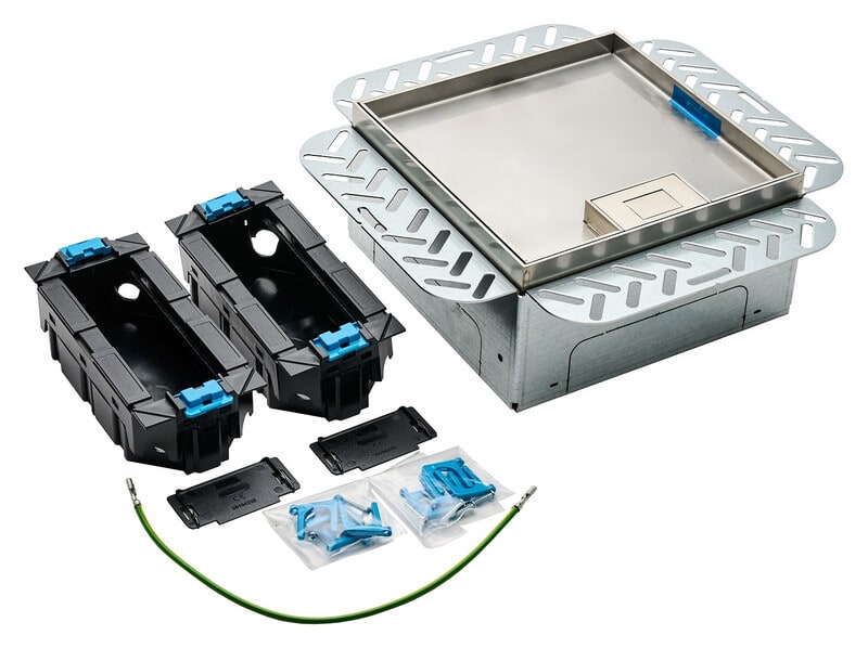 Lattiarasiapakkaus LARA onteloasennus kansi ruostumaton teräs Q06syvennys 15mm LARA-lattiarasiapakkaus onteloasennukseen, nelikulmainen, korkeussäädettävä, sisältäen teräslevystä valmistetun onteloasennuskehyksen, 4 x kierretanko M8, 4 x lukitusmutteria M8, 1 x maadoitusjohdin 300 mm, kaapeliaukollisen kasettityyppisen lattiarasiakannen Q06 15 mm lattiapinnoitesyvennyksellä, tiivisteen, kaapelipidikkeen, 2 x kojerasia 3 kojeelle 45 x 45 mm. Varustus erikseen tilattavilla 45x45 kanavakalusteilla, esimerkiksi gallery-sarjasta. Tuote soveltuu asennettavaksi ontelolaattaan tai vastaavaan lattiapintaan kuivissa sisätiloissa, joissa on kuivapuhdistettavat lattiat. Standardien DIN EN 50085-1 ja DIN EN 50085-2-2 mukainen.