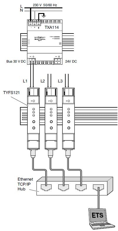 Reititystoiminto (KNXnet/IP reititys)IP-reititin liittää kaksi erillistä KNX-väylälinjaa tietoverkkoon, samalla eristäen ne galvaanisesti. Tämä mahdollistaa linjojen käytön toisistaan riippumattomina väylälinjoina. Reititintä voidaan käyttää linja kytkimenä tai aluekytkimenä olemassa olevissa KNX-verkoissa kuten myös uusissa KNX-verkoissa. TYFS121 sisältää suodatustaulukkomäärityksen, sille mitkä viesti saavat liikkua rajapinnan yli linjaan tai linjasta pois väyläkuormituksen vähentämiseksi. ETS luo suodatustaulukon automaattisesti määrittelyn ja järjestelmän käynnistyksen yhteydessä. Sen lisäksi, käsikäyttötila mahdollistaa hetkellisesti sammuttaa suodatus viestien päästämiseksi läpi, joka helpottaa tiettyjä testejä, joita saatetaan tehdä käyttöönoton yhteydessä.