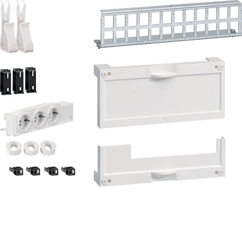 Kalustuspakkaus data-asennuskentälle, univers, 3xpistorasiamoduulilla,ristikytkentäpaneeli 24xRJ45 Keystone sekä kaapeli- ja laitekannakkeet. Asennuspakkaus FWUxxK1 -koteloiden data-asennuskentän varustukseen ristikytkentäliitinlevyllä ja pistorasiamoduuli tilaan tulevien toimilaitteiden sähkönsyöttöön peiteosineen. Liitinlevy Keystone-mitoitetuille RJ45-liitinmoduuleille data- ja AV-liitynnöille.