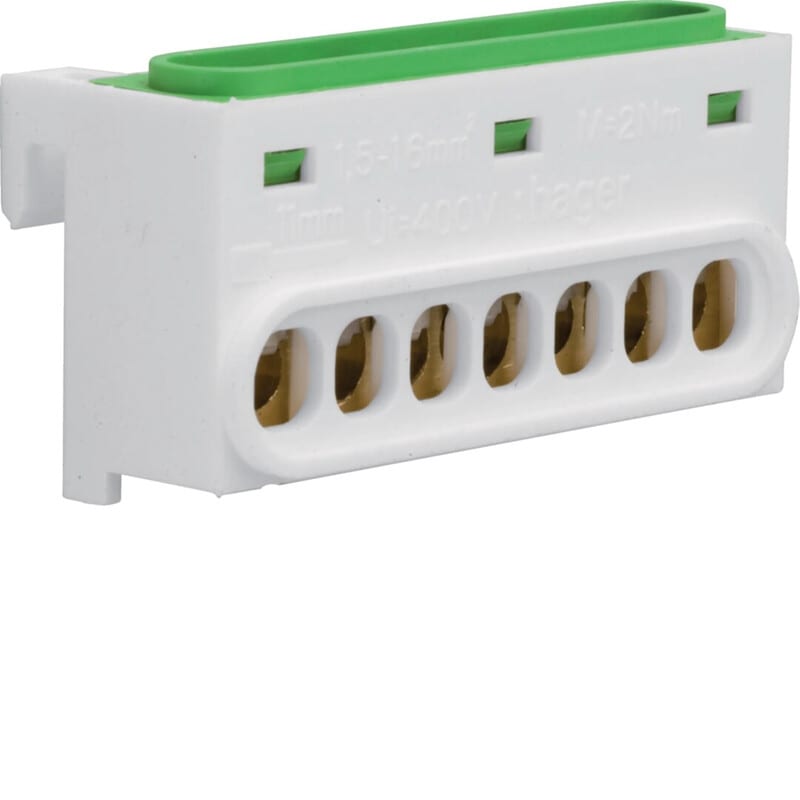 PE-liitin 7 liitinpaikkaa, Minigamma, IP2x, vihreä PE-liitin 1x7 liitintä IP2X vihreä, johdinpoikkipinnoille 1,5 mm2 … 16 mm2. Asennus liitinsillan GZ108S tai GZ110S kanssa.