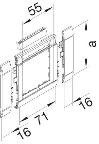 Kanavajärjestelmät: BRP, BRHP, BKIS, DA Kanavaleveys: 80 mm Materiaali: ABS Halogeeniton: kyllä Väri: liikenteenvalkoinen RAL-värikoodi: 9016 Pituus: 103 mm Aukon korkeus: 55 mm Aukon leveys: 55 mm Suojakalvolla: ei Sauman peittävä: kyllä