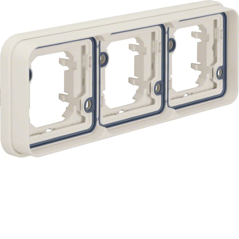 Uppoasennuskehys 3-osainen vaaka, tiivisteellä IP55, W.1, puhtaanvalkoinen matta Uppoasennuskehys Berker W.1 3-osainen vaakasuuntaisiin yhdistelmiin, ruuvikiinnityssovitteilla ja tiivisteellä kalustekeskiöiden asentamiseksi seinäpintoihin kojerasioiden päälle IP55-tiiveysluokan vaativiin asennuksiin.