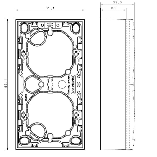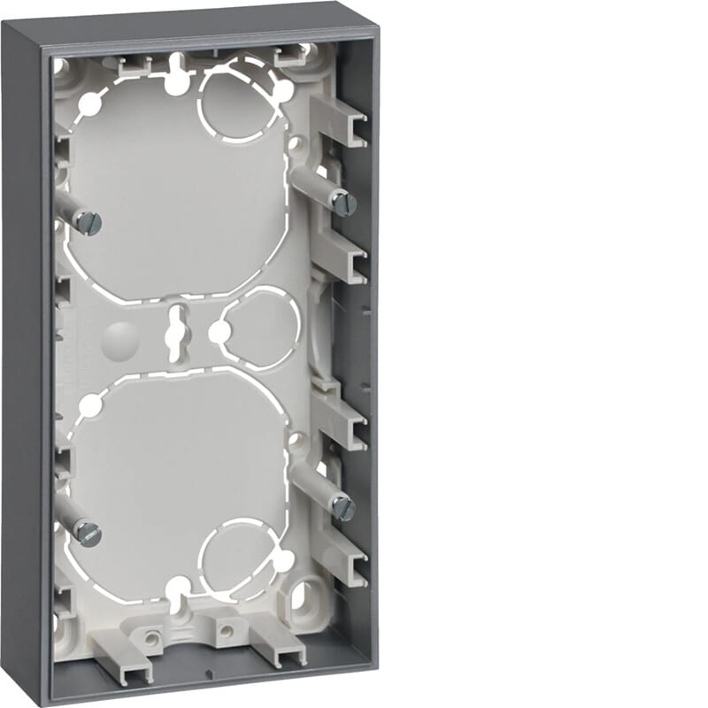 Pintakojerasia 2-osainen 30mm, S.1, alumiini matta, maalattu Pintakojerasia 2-osainen S.1, syvyys 30 mm, matalarakenteisten uppoasennettavien kytkin- ja painikekojeiden asentamiseksi pintaan. Rasiapohja läpilyöntiaihiolla kojerasiakiinnitykseen ja kolmella läpilyöntiaihiolla putkille. Varustettavissa kahdella vedonpoistimella, jotka ovat tilattavissa lisätarvikkeena. Materiaali kestävä Thermoplast-muovi, väri alumiini matta maalattu.