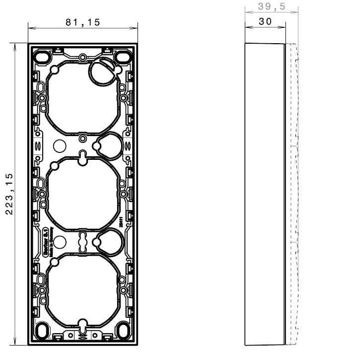 Pintakojerasia 3-osainen 30mm, S.1, puhtaanvalkoinen matta Pintakojerasia 3-osainen S.1, syvyys 30 mm, matalarakenteisten uppoasennettavien kytkin- ja painikekojeiden asentamiseksi pintaan. Rasiapohja läpilyöntiaihiolla kojerasiakiinnitykseen ja kolmella läpilyöntiaihiolla putkille. Varustettavissa kahdella vedonpoistimella, jotka ovat tilattavissa lisätarvikkeena. Materiaali kestävä Thermoplast-muovi, väri puhtaanvalkoinen matta.