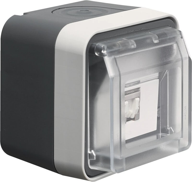 Datapistorasia harmaa kirkkaalla suojakannella, 1xRJ45 Kat 6 suojattu, soveltuu PoE+ -käyttöön, liitinmoduulin kytkentä LSA+-työkalulla, pinta-asennus IP55 Datapistorasia 1xRJ45 Cat 6a suojattu pinta IP55, W.1, harmaa