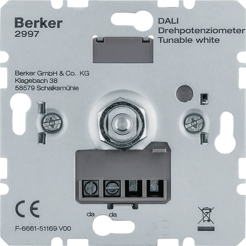 Valonsäädinpotentiometri DALI-liitäntälaitteellisten ryhmienhimmennykseen ja värilämpötilan säätöön ryhmäohjella. Asennus varustettava erillisellä DALI-teholähteellä. Yhteensopivat sarjat S.1, Q.1/Q.3/Q.7/Q.9, R.1/R.3/R.8, K.1/K.5 DALI-potentiometri DALI-liitäntälaitteellisten valonlähteiden himmennysohjaukseen. Potentiometriin liitettävä erillinen DALI-teholähde. Voidaan liittää maksimissaan 64 liitäntälaitetta. Ohjaustoiminnot päälle/pois, himmennys ylös/alas ja valkoisen värin värilämpötilan säädöllä (Tunable White). Keskiölevy tilattava erikseen käyttöön valitun kalustesarjan mukaan S.1, Q.x, K.x, R.x.