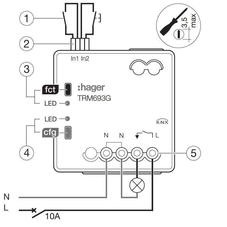HAGER - Tulo/lähtöyksikkö KNX - TRM693G 3A RLCPD+2PV uppo