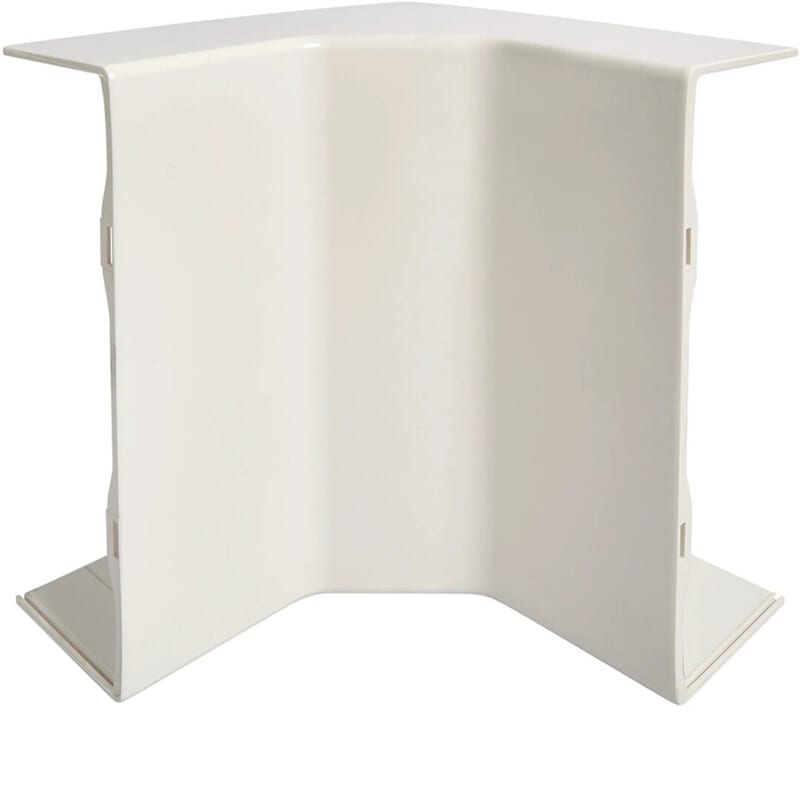 3D-kulma GBD/GBA 56x162, liikenteenvalkoinen, ABS halogeeniton Halogeenittomasta ABS-muovista valmistetulla 3D-kulmalla haaroitat helposti pystynousut sisäkulma-asennuksesta. Materiaalinsa ansiosta tuote soveltuu käytettäväksi sekä muovisten että alumiinisten johtokanavien kanssa. Kanavarungon reunojen päälle tuleva muoto-osa peittää kanavan katkaisun epätasaisuuksia ja varmistaa näin siistin asennuksen. Standardinmukaisuus EN 50085-1 ja EN 50085-2-1.